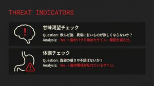 | 甘味渇望チェック | 0カロリーコーラを飲んだ後、いつもよりケーキやクッキーみたいな甘いものが欲しくなってないか?もしそうなら、お前の脳はバグり始めてるサインだ。すぐに飲むのをやめるか、頻度を減らせ。 |