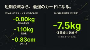 短期的な研究(RCT)では「痩せる」という結果が出ている一方で、数年単位の長期的な研究(観察研究)では、真逆の結果が出てるんだ。