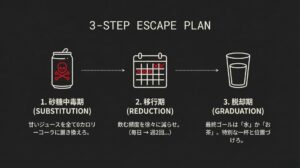 | ステップ3(脱却期) | 最終的なゴールは、喉が渇いたら「水」か「お茶」を飲む習慣を身につけること。0カロリーコーラは、本当に甘いものが欲しい時の「特別な一杯」くらいの位置づけにする。 |