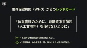 WHOは、世界中の研究をレビューした結果、「体重管理のために、非糖質系甘味料(人工甘味料)を使わないように」っていう、超強力な勧告を出したんだ。